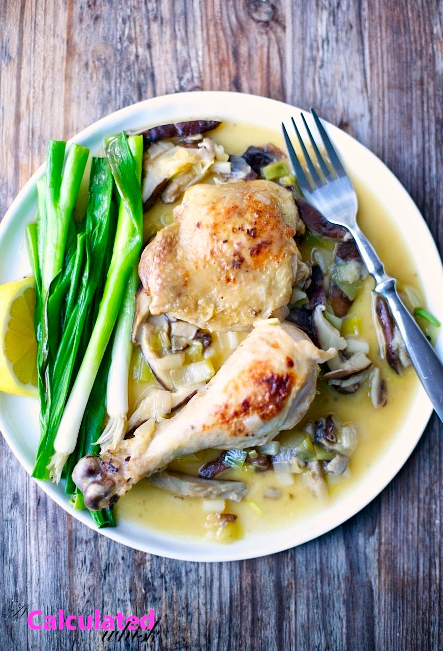 The second reason is that braising involves a one-two punch of searing and then simmering, which makes the chicken moist, tender, and very flavorful. For this dish, chicken thighs and drumsticks are seared in ghee and then simmered with mushrooms, leeks, thyme, and chicken stock. To add an extra level of flavor and color, fresh scallions and lemon juice are added at the end, and then the whole pan goes under the broiler to crisp up the chicken a bit and gently wilt the scallions.